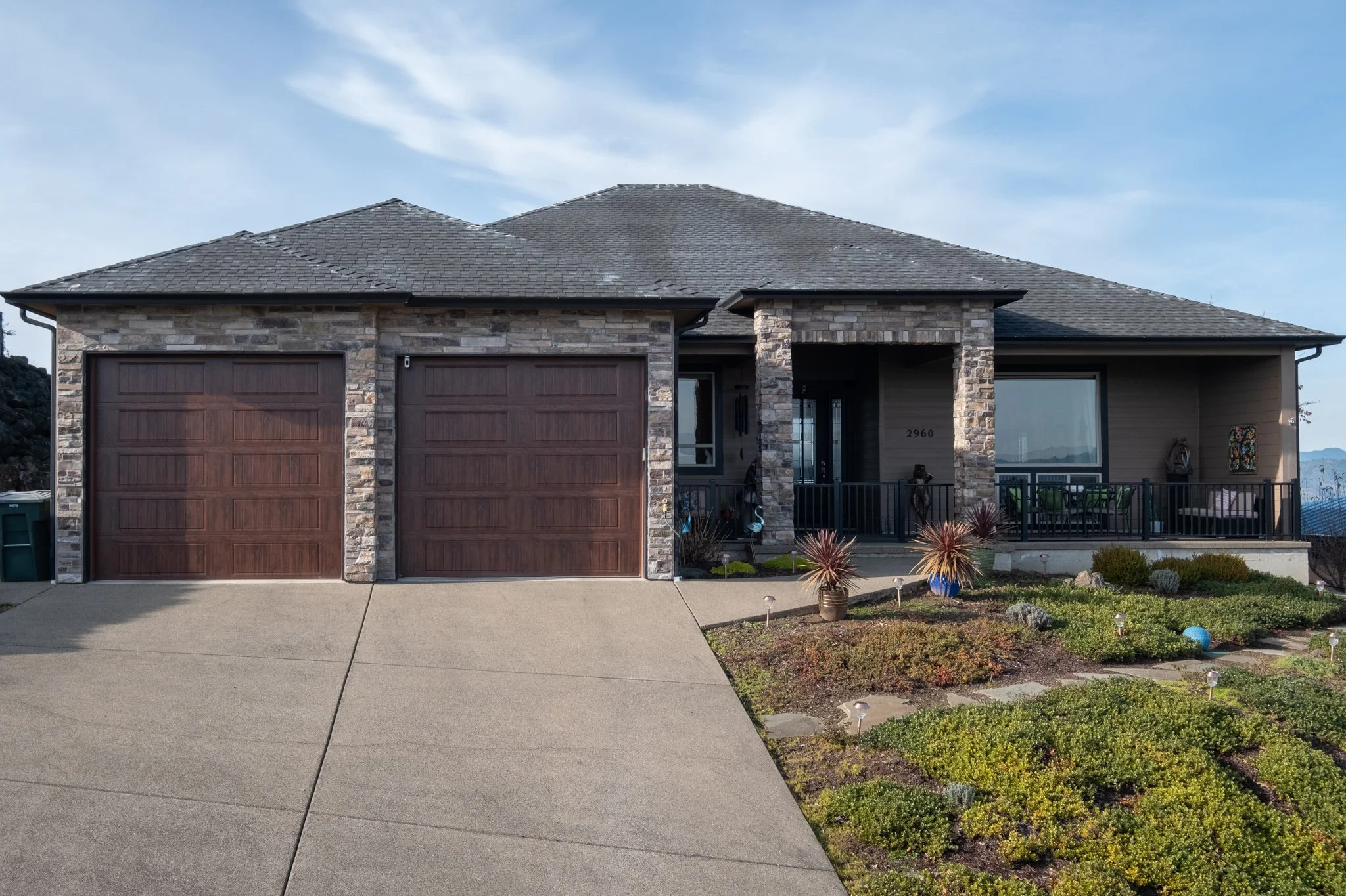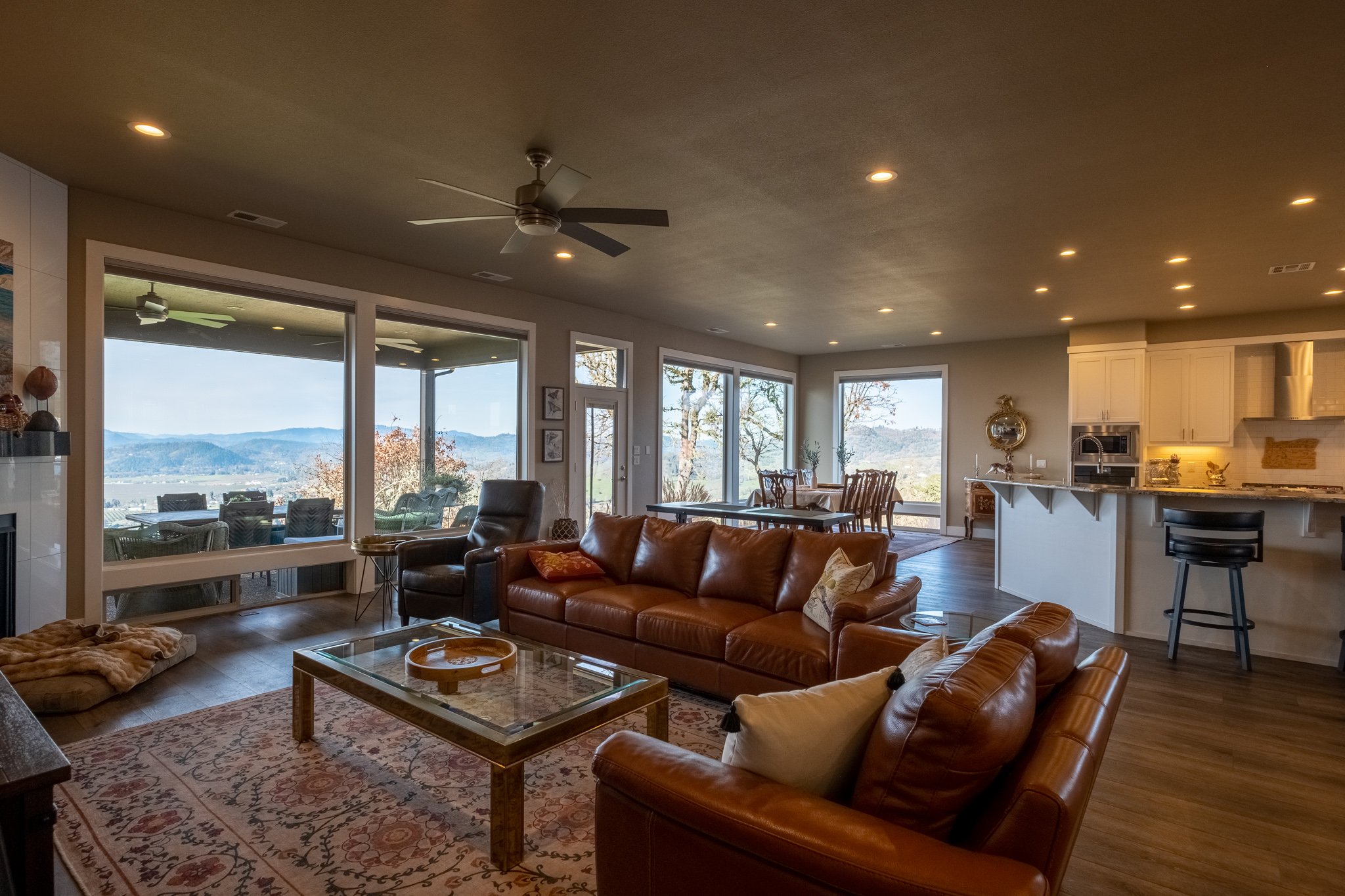 Commanding views of Garden Valley and Roseburg frame this refined, single-level residence showcased in the 2016 Tour of Homes. Thoughtfully designed and gently lived in, this 4-bedroom, 2.5-bath home offers an elegant open-concept layout with soaring 10-foot ceilings and upscale finishes throughout this spacious 2,796 sq ft floor plan. The chef’s kitchen features granite surfaces, tile flooring, a walk-in pantry, and generous storage—perfectly suited for both entertaining and everyday comfort. Contemporary gas fireplaces create a warm, sophisticated ambiance in the great room and primary suite. Recent enhancements include updated flooring and kitchen appliances; including a new Wolf gas cooktop. Covered front and rear patios extend the living space outdoors, offering a serene setting to enjoy the sweeping valley and city views year-round.
